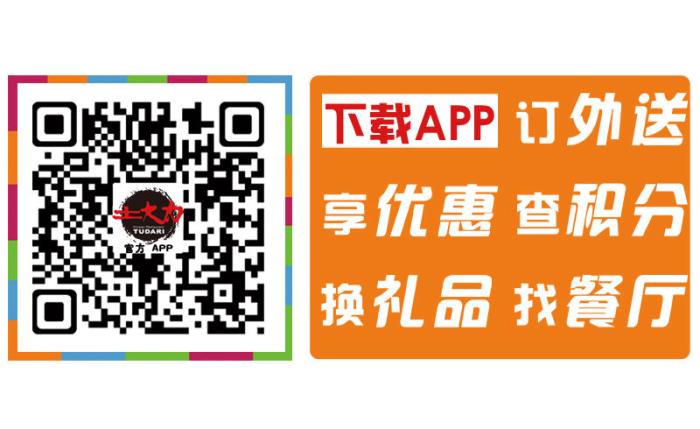 时尚休闲的土大力,始终把消费者的体验放在第一位。移动互联时代的今天,手机已成为我们生活中不可或缺的一部分,土大力自然要与时俱进,推出了适合手机的土大力App,方便广大粉丝及时了解土大力最新优惠和资讯。通过土大力APP,您可以及时了解土大力最新资讯,找餐厅、换礼品、要外送、订座位以及留下您对土大力的宝贵意见等尽在土大力App,同时出示App的会员二维码就可以享受餐厅的会员优惠哦!官网App下载,扫描二维码即可。